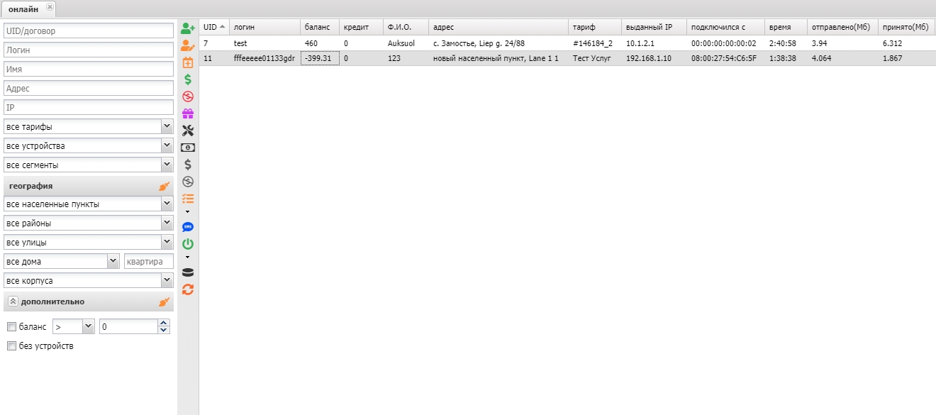 Содержит список абонентов находящиеся сейчас "онлайн". Информация берется из таблицы radacctbras в базе данных.
