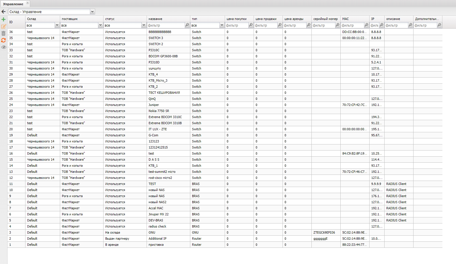Склад показывает информацию о всем оборудовании которое добавлено и используется в биллинге. При создании устройства, BRAS или добавлении устройства пользователя система проверит наличие вещи с такими параметрами (IP/MAC/Serial) на складе и если такой вещи не найдется то создаст её. Это позволит персоналу действовать как они привыкли ранее не отвлекаясь на создание дополнительных записей на складе. Благодаря двухсторонней связи не важно где будет внесено изменение, в свойствах самого устройства или же в свойствах вещи на складе, изменение отобразятся и там и там. Из за того что изменения сохраняется за вещью на складе а не за устройством (как было раньше), это позволяет видеть полную историю вещи: какие параметры когда были, у какого абонента или на каком адресе была закреплена эта вещь и т.д.