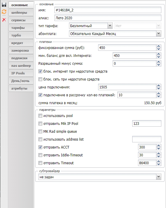При создании абонента, если у сотрудника есть права изменения рассрочки, сотрудник может снять или поставить галочку "Использовать рассрочку". В результате чего сумма подключения будет снята сразу или добавлена в рассрочку.