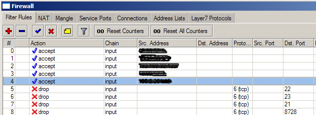 Рекомендуется разрешить полный доступ для ваших IP (биллинг и другие узлы) в первых правилах цепочки input. И следом за ним сделать DROP на портах TCP 21,22,23,8728 для всех хостов. Ниже пример подобной настройки.