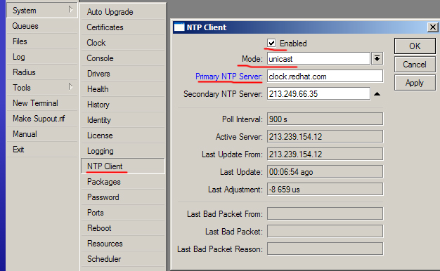 После настройки интернета, активируйте систему NTP для синхронизации времени. Откройте System→NTP Client Включите службу, выберете mode unicast и укажите сервер как на скриншоте.