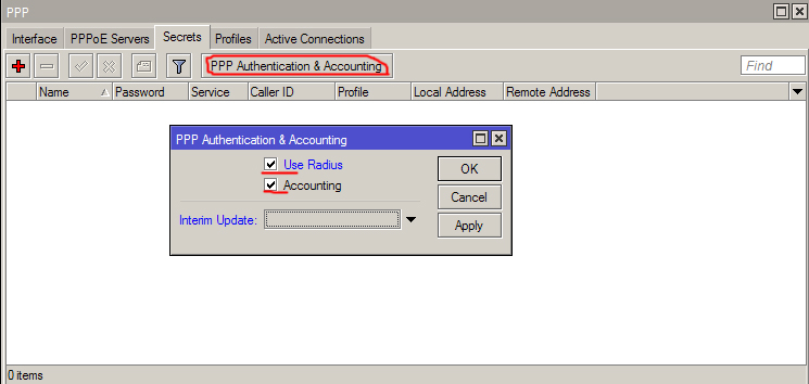 Переходим во вкладку Secrets Нажимаем на "PPP Authentication & Accounting" и делаем как на скриншоте.
