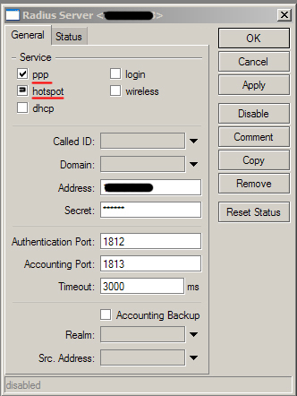 Укажите в графе address - IP биллинговой машины. Секрет - этот же секрет вы укажите в настройке NAS-сервера в "админке" билилнга. Timeout - для одного сервера поставте 10000.