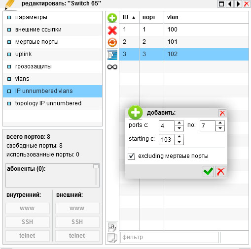Открываем наш "надомный" свич что мы создали ранее (TP-Link 8) Открываем вкладку "IP unnumbered vlans" и добавляем через + vlan которые будут указаны в настройках этого свича.