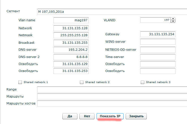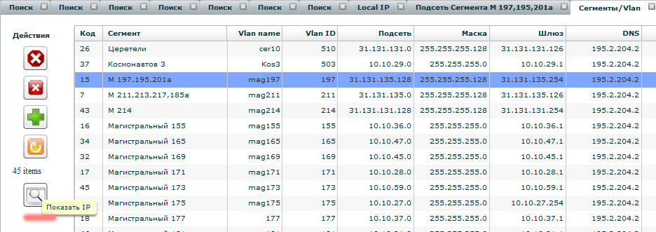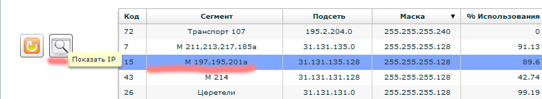 2й способ редактировать или просматривать список IP в Сегменте Если открыть Меню→Настройки→Сегменты/Vlan и в списке выбрать Сегмент, слева появится дополнительная кнопка "Показать IP" (нажмите на ее)