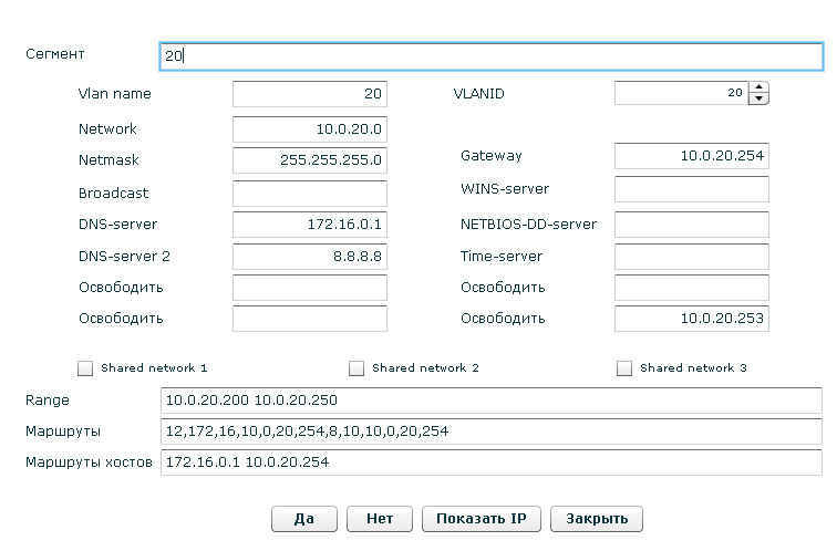 - Чтобы в каждом из сегментов вновь подключенным клиентам выдавался IP из диапазона range ( тем у которых еще не занесен MAC-адрес в их "учетную запись").