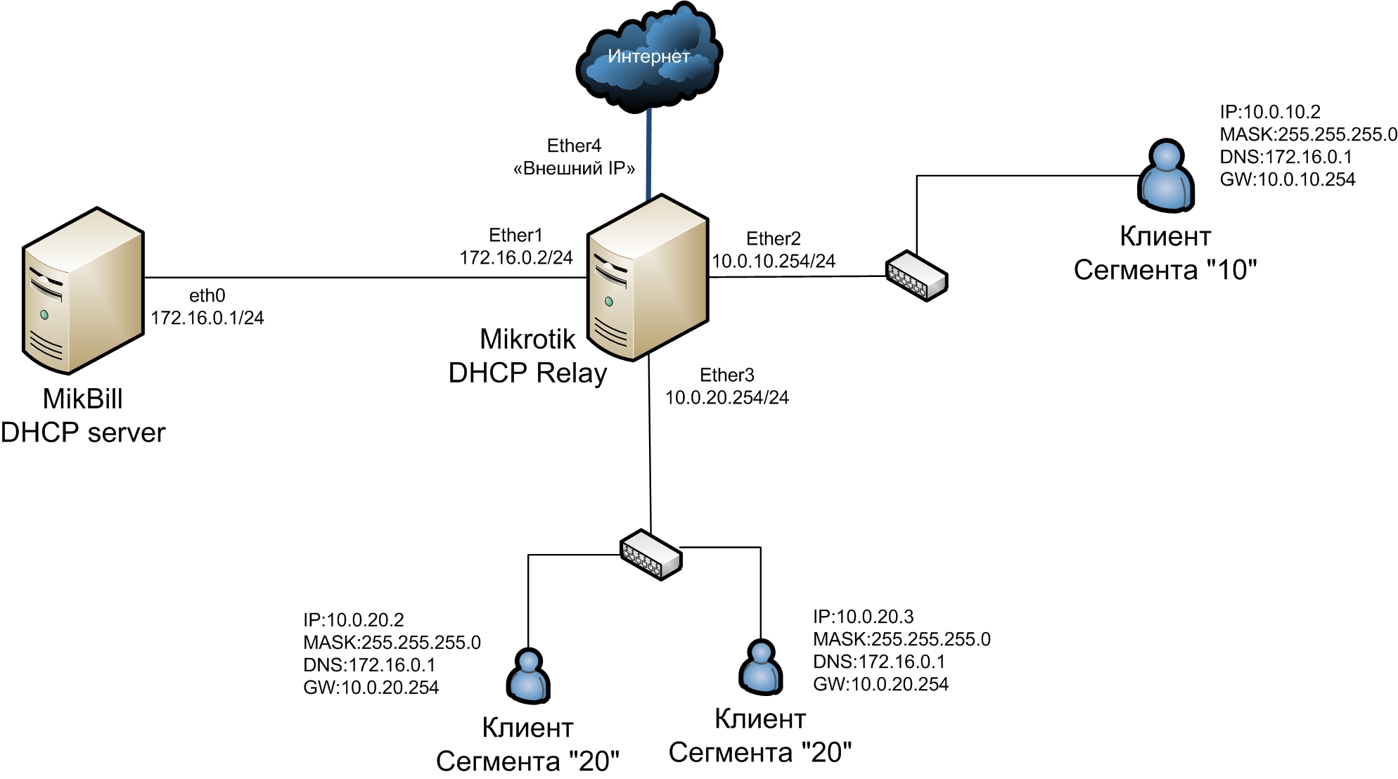 Так что же такое Сегмент - в терминах MikBill ? - По сути это описание обычного Сегмента Вашей сети, его свойства и параметры. Ниже мы попытаемся в рамках примера объяснить его логическое и функциональное назначение. Данный пример является простым и универсальным, который покажет общие принципы организации DHCP relay, настройки Сегментов в MikBill