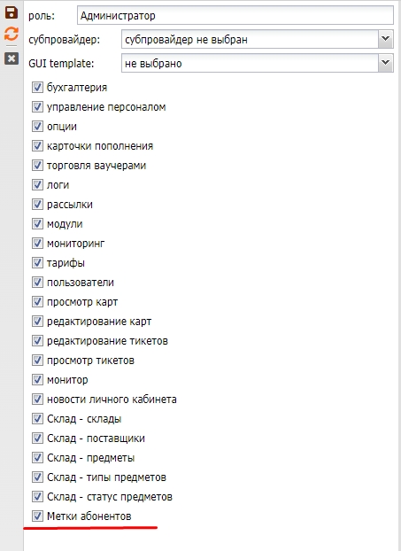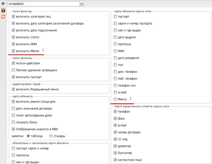 Так же необходимо что бы галочка Метки была выключена в блоке Карта абонента скрыть поля, данная галочка убирает поля меток с карта абонента, по этому её нужно выключить.