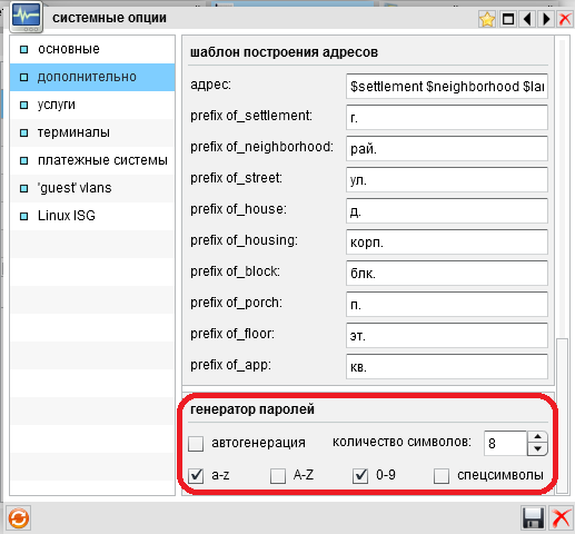 Описание: При создании учётной записи абонента будет доступна кнопка генерации пароля. Также можно в Системных Опциях настроить таким образом, чтобы пароль генерировался при открытии окна создания абонента автоматически (параметр автогенерация).
