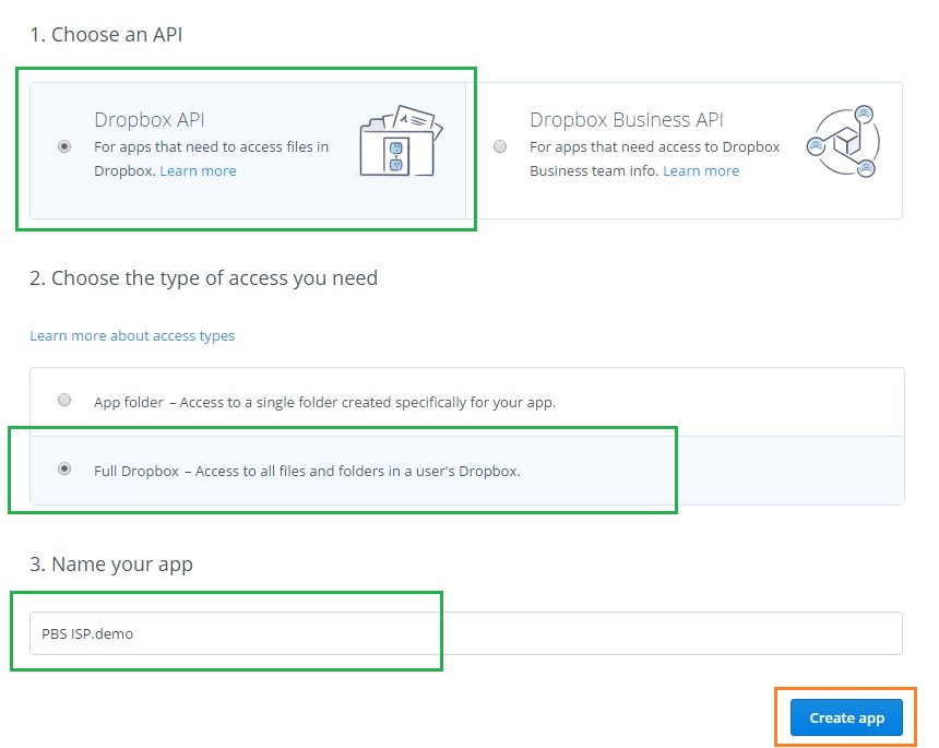 Необходимо создать приложение на dropbox. Переходим по ссылке и создаем приложение: https://www.dropbox.com/developers/apps/create