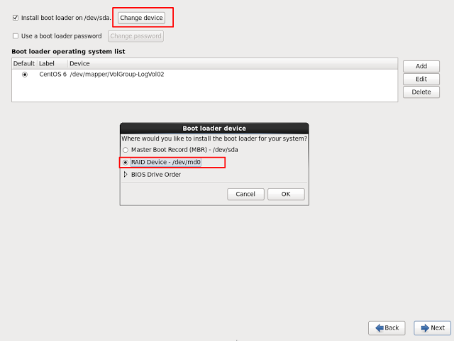 11.2.11 Далее будет выбор точки автозапуска системы, не забываем настроить. Выбираем Change device - наш раздел, куда мы настраивали /boot. В данном примере это /dev/md0