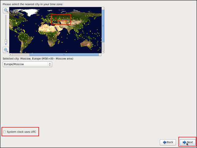 9. Далее важная настройка времени, которую частенько опускают и к ней приходиться возвращаться. Выбираем свой пояс на карте или из выпадающего списка ниже. Также смотрим чтобы не стояла галочка на "System clock uses UTC"