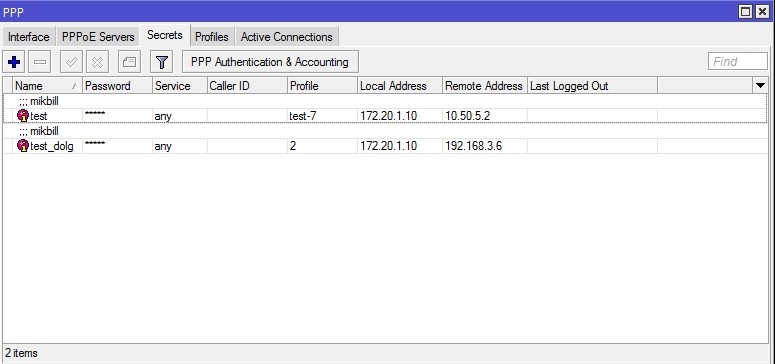 Т.е. при потери связи с биллингом, микротик активирует учетные записи в PPP→Secret. Данный метод конечно не распространяется на тот случай если возникли неполадки в работе MySQL или Radius, но Вы всегда можете быстро активировать учётные записи в ручном режиме. Удаленный тест микротиком работы Radius сервера будет в следующих наших релизах.