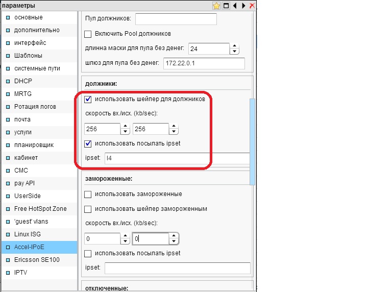 Адреса абонентов имеющие отрицательную задолженность, с учётом специфики схемы L3 будут заносится в списки ipset.