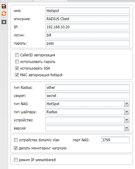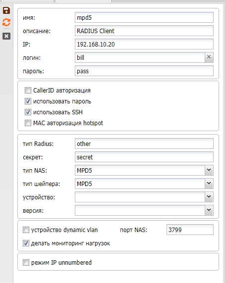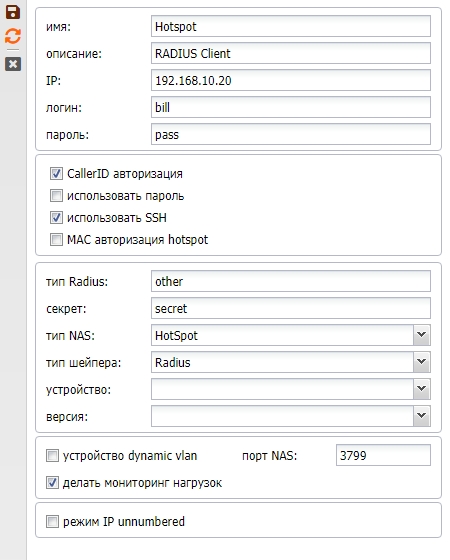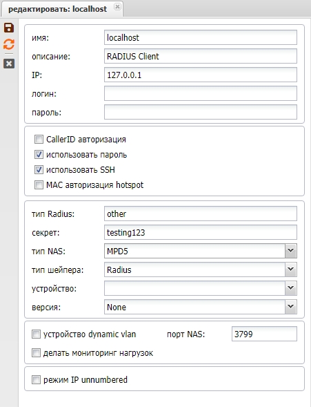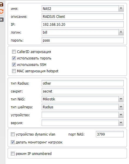 | Использовать SSH | для доступа биллинга к NAS по SSH, либо если чекбокс не стоит, то по телнет – это только для Mikrotik NAS (эту опцию лучше не использовать вообще, пользоваться только SSH) |