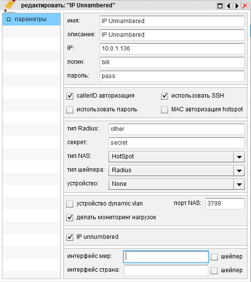 | IP Unnambered | Включить поддержку технологии IP Unnambered для авторизации (авторизация по IP) , необходимо для определенных типов NAS |