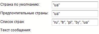 Страны в указываются в формате "ru" - где в кавычках код страны по стандарту ISO 3166-1