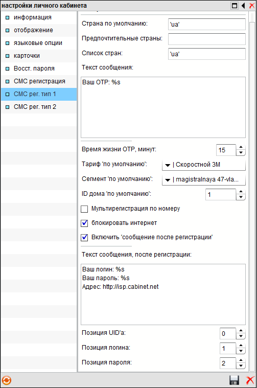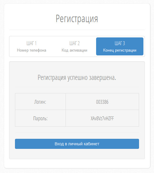 Включить "сообщение после регистрации" - Отправлять СМС сообщении с данными для авторизации в ЛК после регистрации.