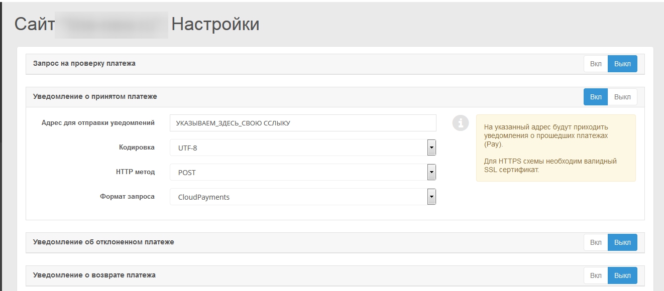- Адрес для отправки уведомлений - заменяем на свой адрес админ панели биллинга URL https://admin.ispnet.demo/ajax/index/cloudpayments/
