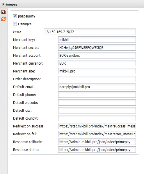 | Response callback | string | ссылка куда платежная система отправляет уведомления об оплате, должна быть вида https://admin.ispnet.demo/json/index/primepay | |