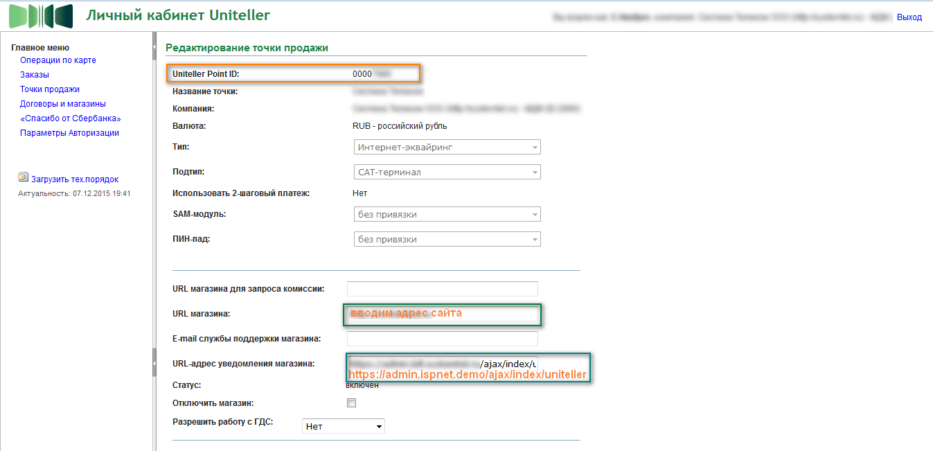 - Редактируем данные и запоминаем Ваш Uniteller Point ID