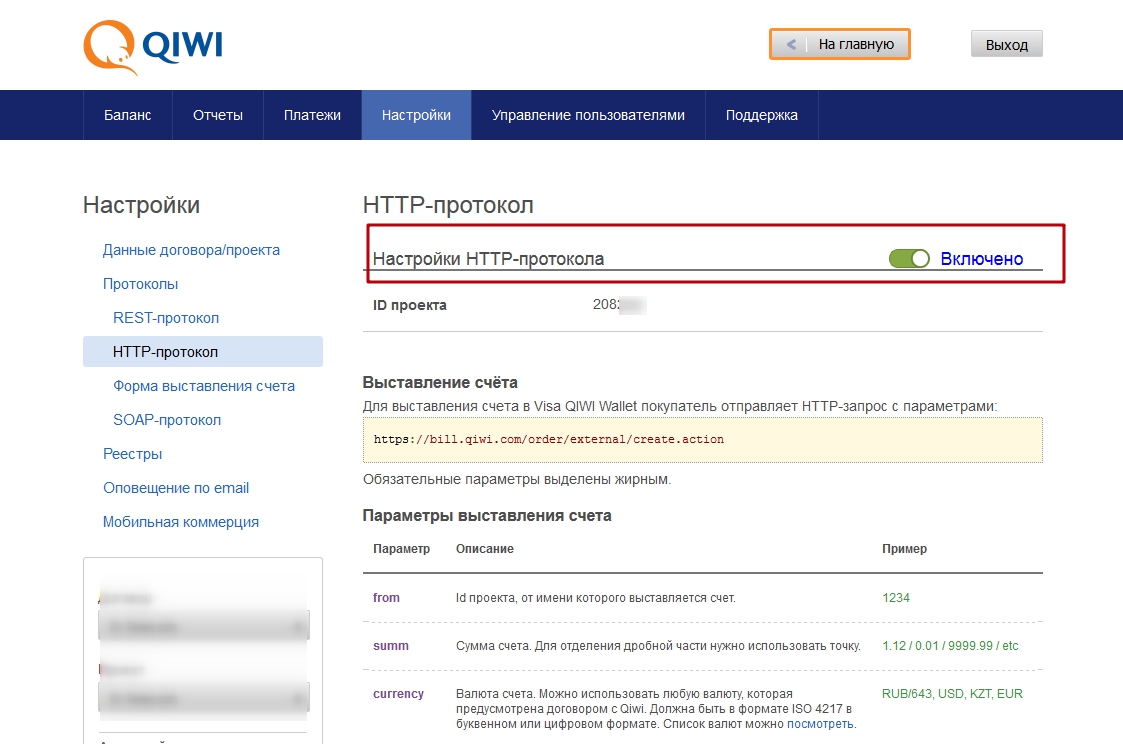 - Переходим в меню HTTP протокол и включаем его (https://ishop.qiwi.com/options/http.action) (рис.4)