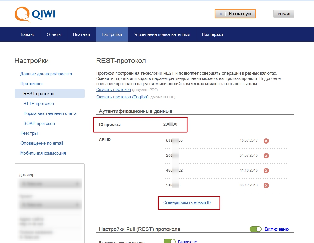- Далее идем в Настройки/Протоколы/REST-протокол https://ishop.qiwi.com/options/rest.action (рис.1)
