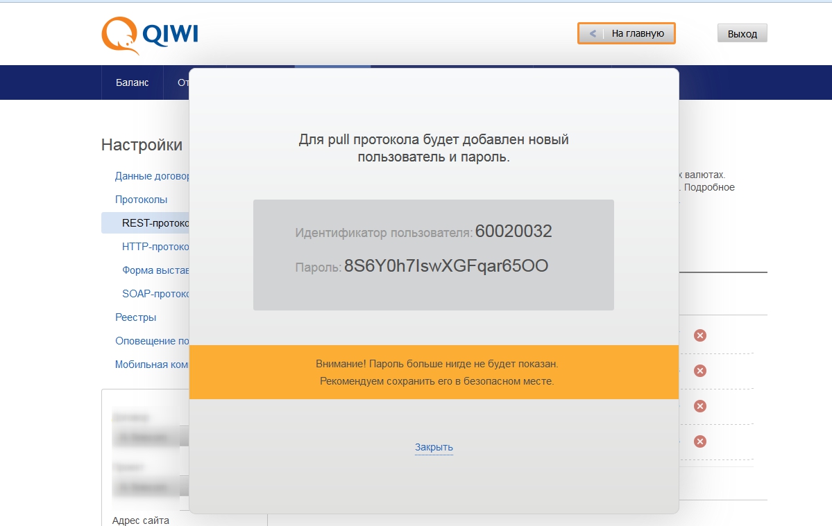• Далее идем в Настройки/Протоколы/REST-протокол https://ishop.qiwi.com/options/rest.action (рис.1)