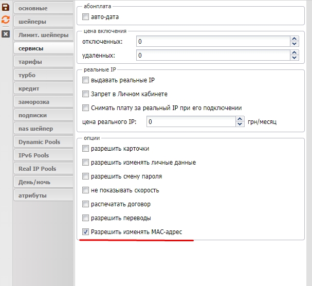 Включить возможность изменять МАC адрес в настройках тарифа (Тарифы ⇒ Свойства тарифа ⇒ Сервисы, опция Разрешить изменять МАК адрес)