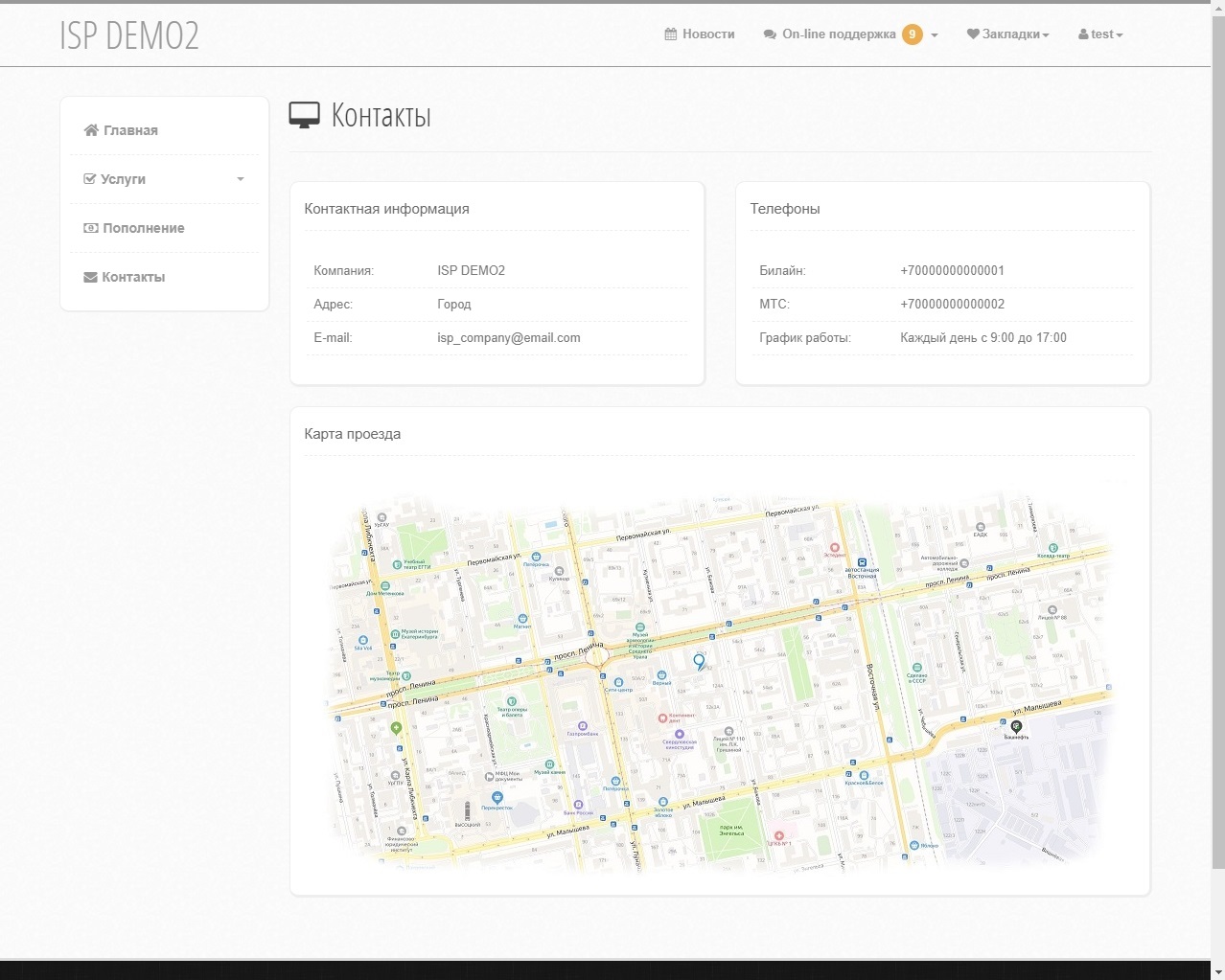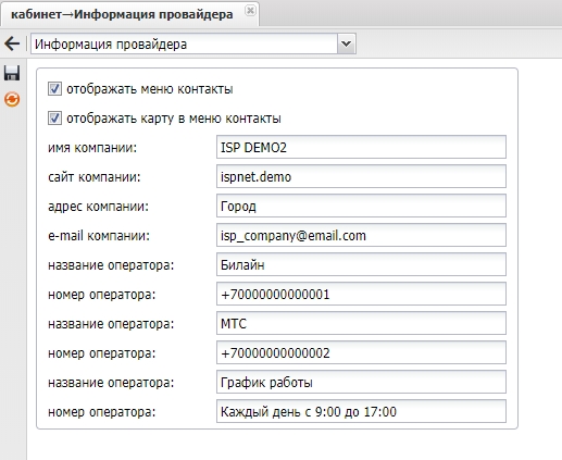 Позволяет добавить в меню пункт "Контакты" где можно указать необходимую информацию для абонента об провайдере, к примеру телефоны, email, график работы, карту проезда.