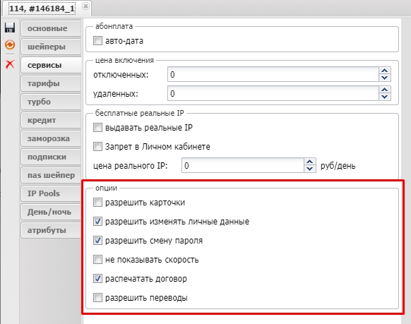 Разрешить смену пароль - разрешает абоненту изменять свой пароль.