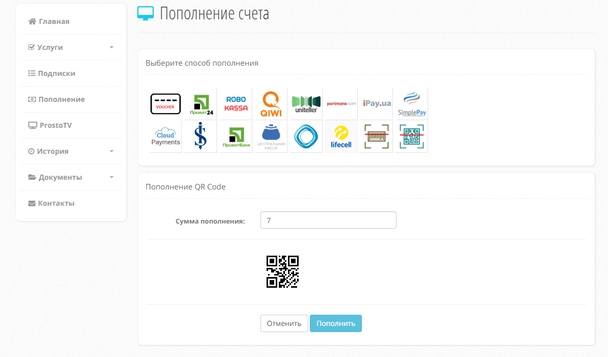 Как это выглядит в ЛК. Абонент вводит сумму и нажимает пополнить. Система генерирует qrcode согласно шаблона.