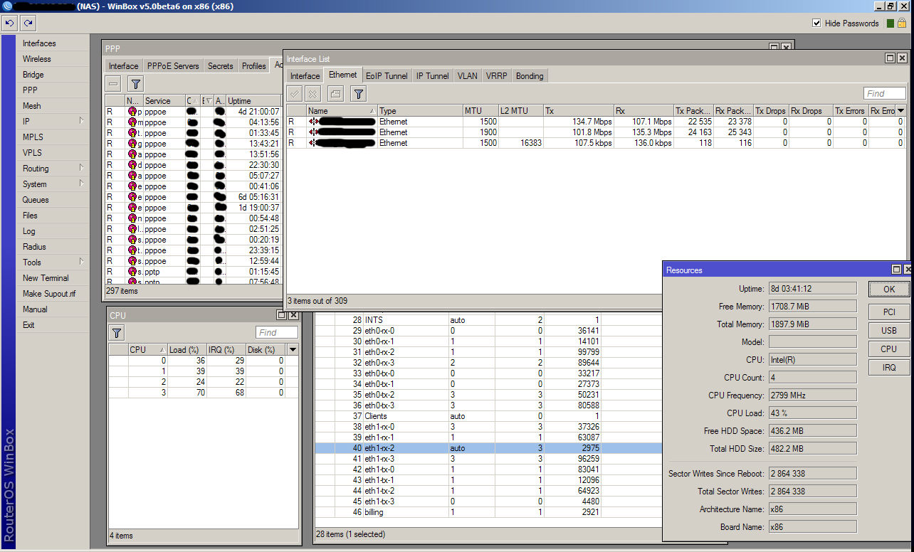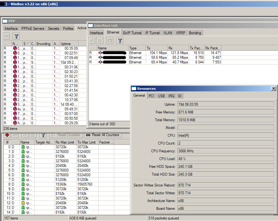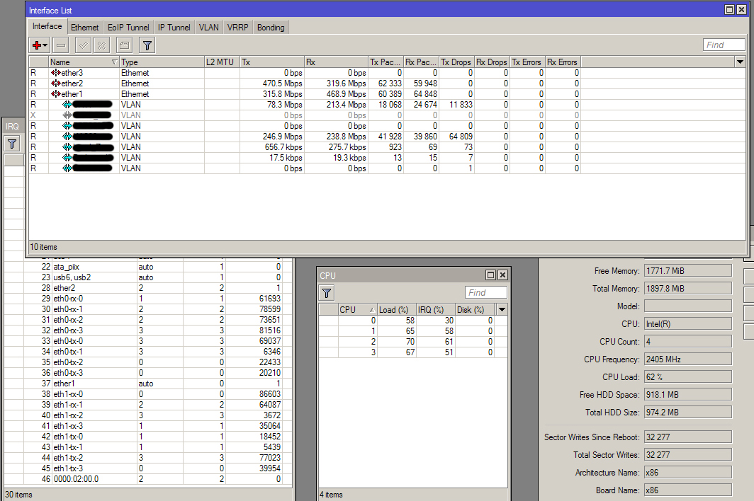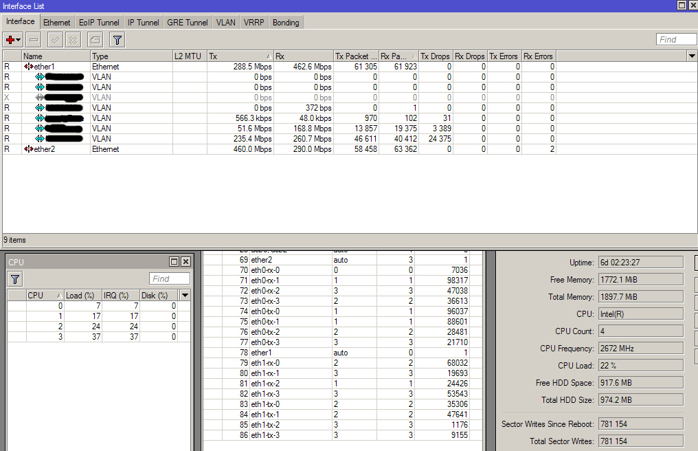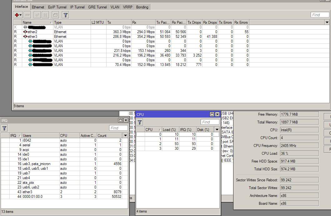 шейпера абонентов(порядка 1000 simple queue на sfq). 2 GB Ram, CPU intel Q6600 Core QUAD