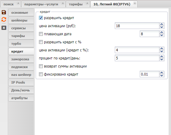 Процентный кредит работает абсолютно по тому же принципу, только дополнительно с абонента снимаются проценты. Настраивается он также в свойствах тарифа (вкладка Услуги).