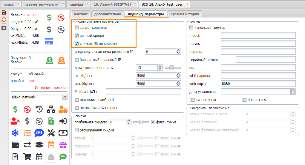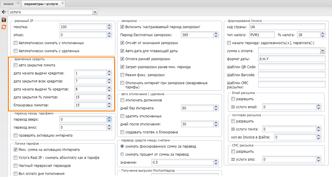 Кредиты необходимы для предоставления пользователям возможности получать услуги после окончания оплаченного периода. Мы можем задать некий период, к примеру 7 дней, для того чтобы пользователь мог за это время оплатить услуги и, без дискомфорта, продолжал пользоваться интернетом. Базовые настройки кредита находятся в системных опциях: