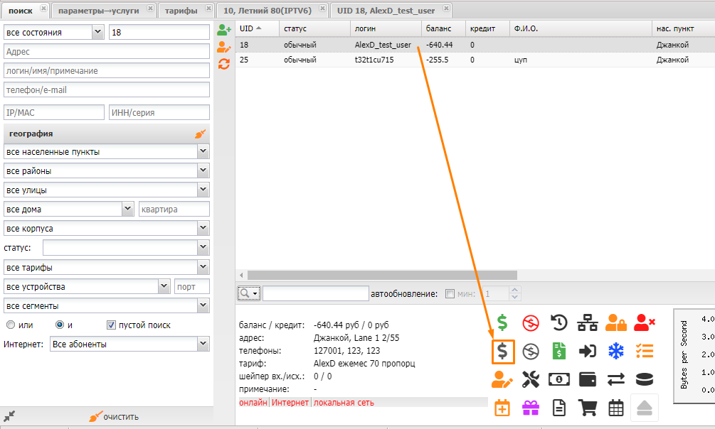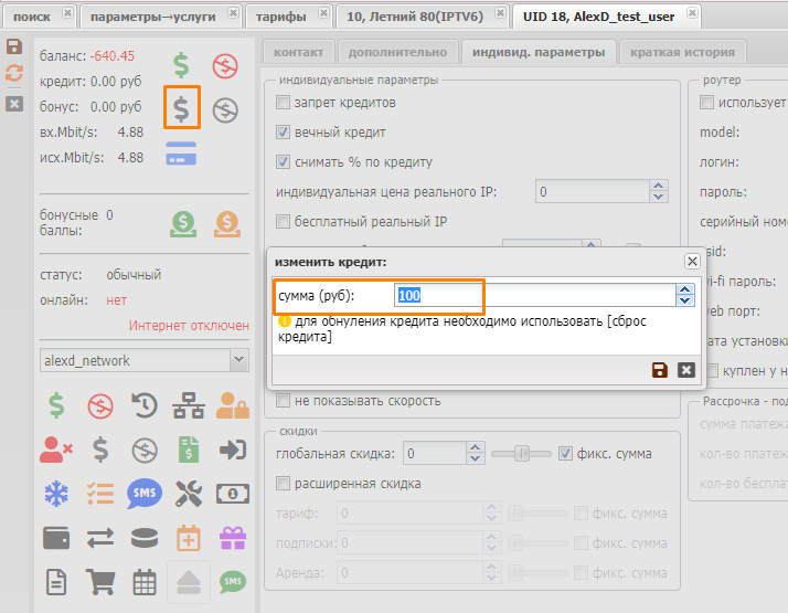В админке можно руками открыть простой кредит какому-то конкретному пользователю. Для этого используются кнопки с иконками в виде серого знака $ (изменить лимит) в нижнем меню абонента или карточке абонента: