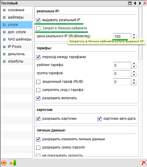 С версии 2.7.5 добавлена возможность активировать услугу Real IP, но сделать недоступным её активацию из ЛК абонента. Сделано для того, чтоб активировать пользователям внешние IP адреса вручную и при этом снималась абон. плата: