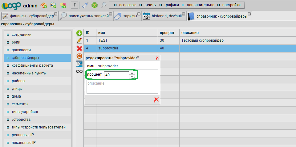 Справочник "субпровайдеры"
