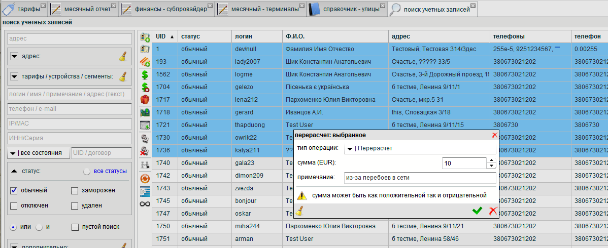 1. Выделяем группу абонентов из таблицы для мультидействия. Для выборочного выделения нажимаем клавишу CTRL + клик левой клавишей мышки, также можно использовать боковой фильтр слева для фильтрации абонентов по различный критериям, к примеру населенный пункт г.Счастье. Потом выбираем желаемое действие(в нашем случае это перерасчет)