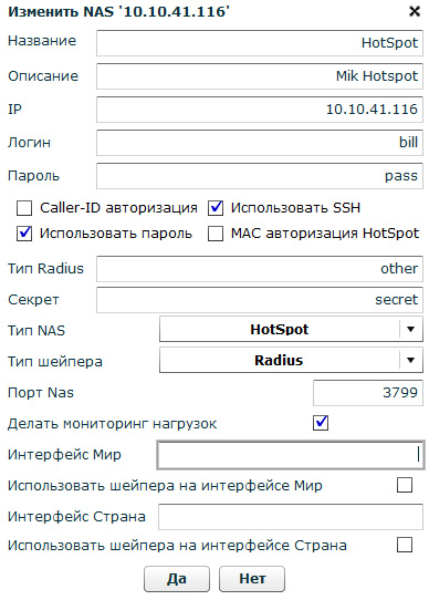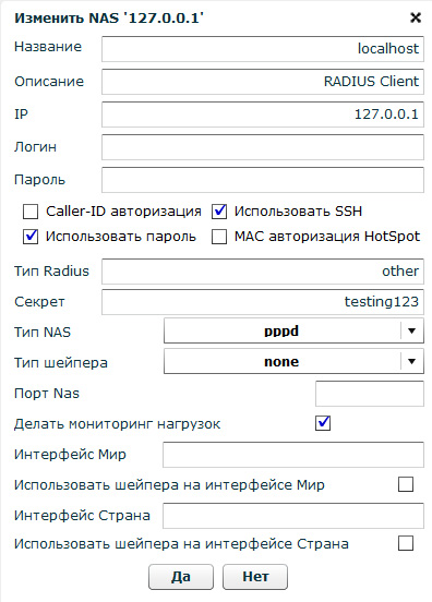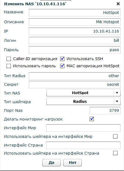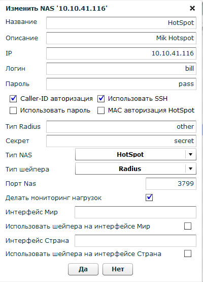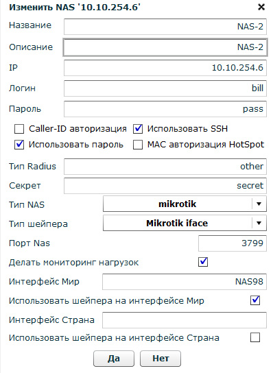 - Использовать SSH – для доступа биллинга к NAS по SSH, либо если чекбокс не стоит, то по телнет – это только для Mikrotik NAS (эту опцию лучше не использовать вообще, пользоваться только SSH)