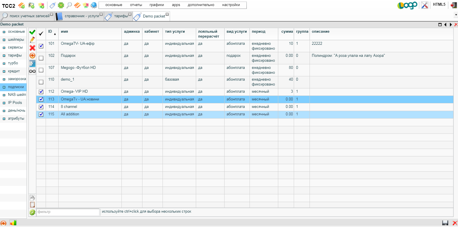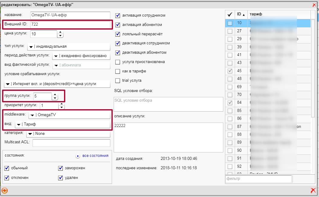 - Указываем группу для услуг OmegaTV больше 1