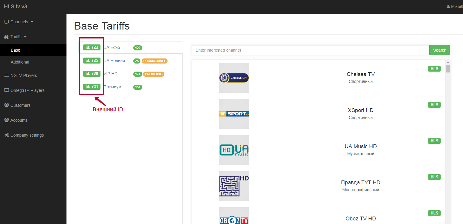 - Указываем Внешний ID услуги который берем в админке OmegaTV
