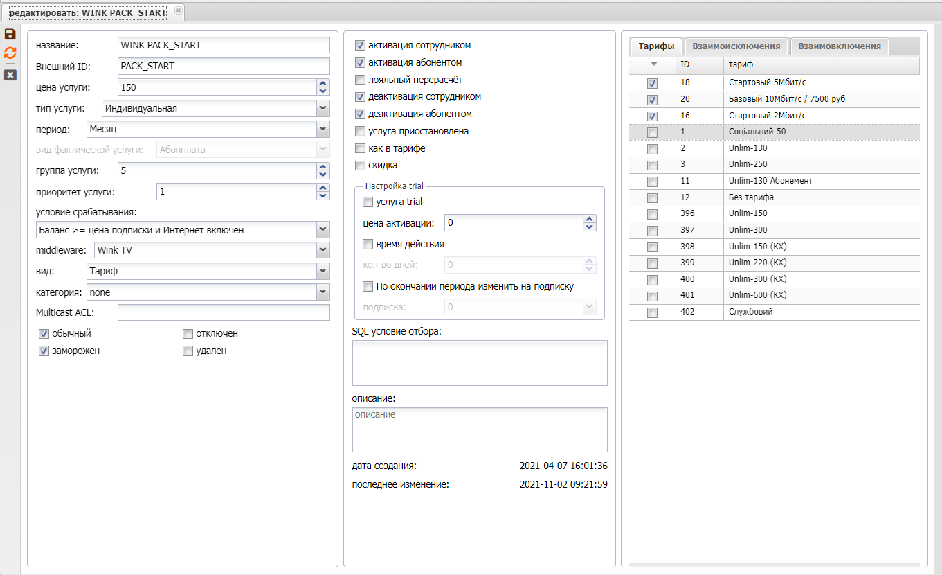 - Указываем вид услуги : Тариф либо Пакет услуг