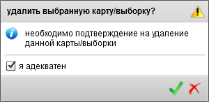 При удалении карты, из таблиц базы данных удаляются, все объекты и правила относящиеся к данной карте, а так же все выборки, родителем которых является данная карта. Процесс необратим.