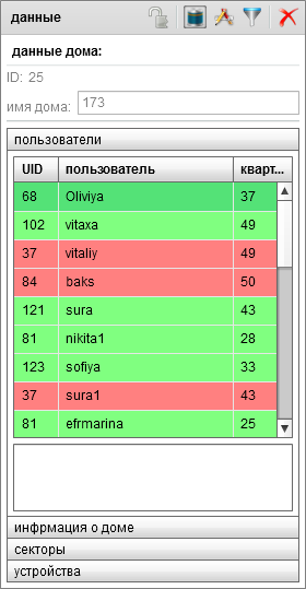 Объект может быть подключен к дому в базе данных биллинга. Мониторит активность пользователей и оборудования относящихся к нему. При полном оффлайне подсвечивается красным, в противном случае подсвечивается зеленым. Если не подключен к базе данных - остается серым.