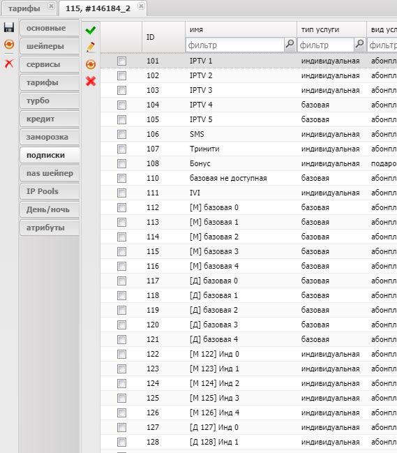 Управление доступными подписками абонента. Для добавлении существующей подписки на тариф необходимо поставить галочку возле необходимой подписки и нажать сохранить. После этого появляется возможно отредактировать некоторые параметры подписки только для данного тарифа.