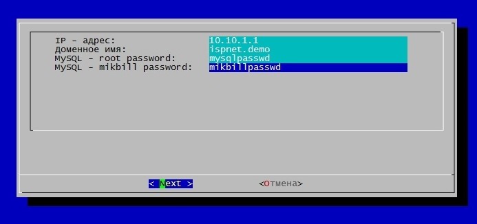 4. "MYSQL - mikbill password:" - Пароль пользователя mikbill для MYSQL.