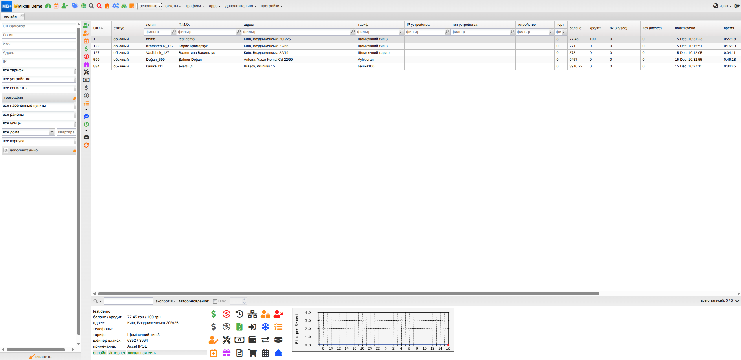Содержит список абонентов находящиеся сейчас "онлайн". Информация берется из таблицы radacctbras в базе данных.