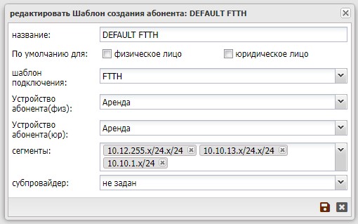 | Сегменты | При создании абонента автоматически назначит IP адрес и сегмент из указанного списка в шаблоне. Если сегменты не указаны, его нужно будет выбрать при создании абонента. |