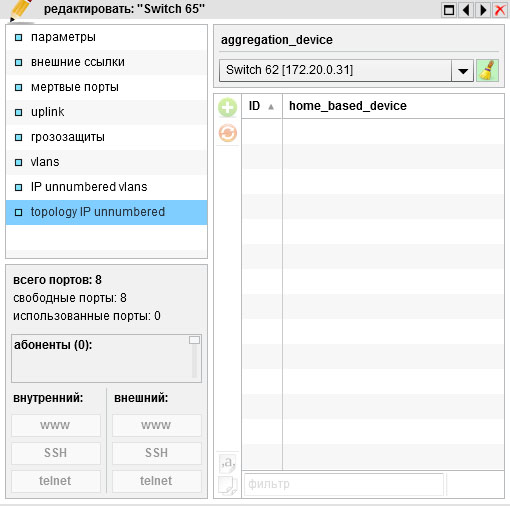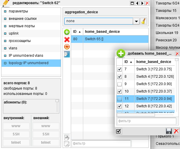 открываем свич агрегации , в нем вкладку "topology IP Unnumbered" и жмем + чтобы увидеть список свичей на более нижний уровень. Так можно более удобно указать большой список свичей для "надомного" уровня.